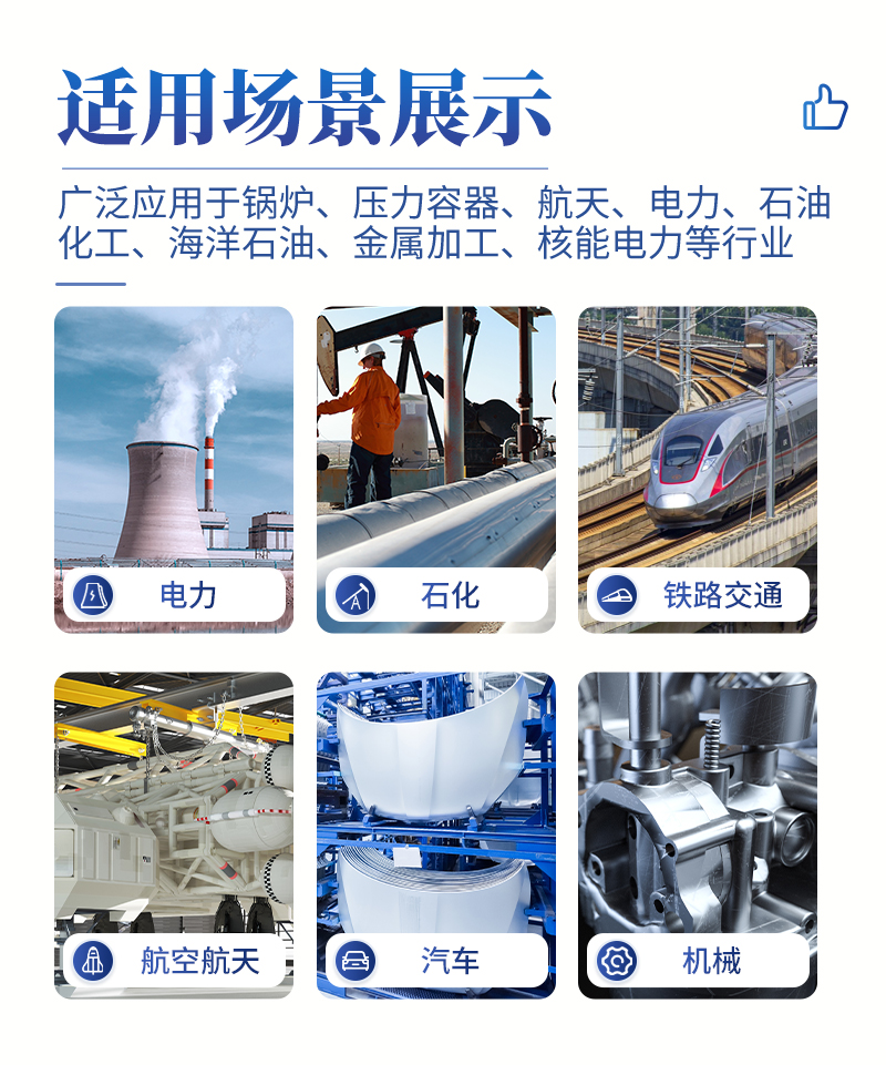 超声波探伤仪是一种便携式工业无损探伤仪,它能够便携、无损伤、准确地进行工件内部多种缺陷(裂纹、疏松、气孔、夹杂等)的检测、定位、评估和诊断。既可以用于实验室,又可以用于工程现场。应用在锅炉、压力容器、航天、电力、石油、化工、海洋石油、管道、船舶制造、汽车、机械制造、冶金、金属加工、钢结构、铁路交通、核能电力、高校等行业。