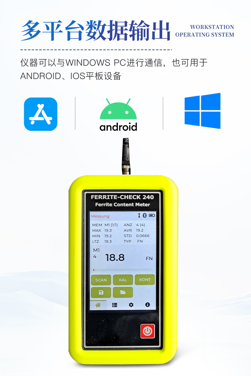 LCD彩色触摸面板,操作方便,分辨率为320x480像素。带橡胶保护套,显示FN或Fe%的测量结果。