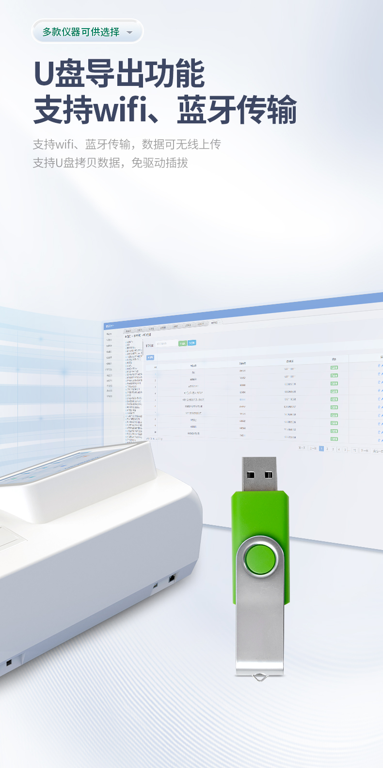 5、支持wifi、蓝牙传输,数据可无线上传;支持U盘拷贝数据,免驱动插拔。