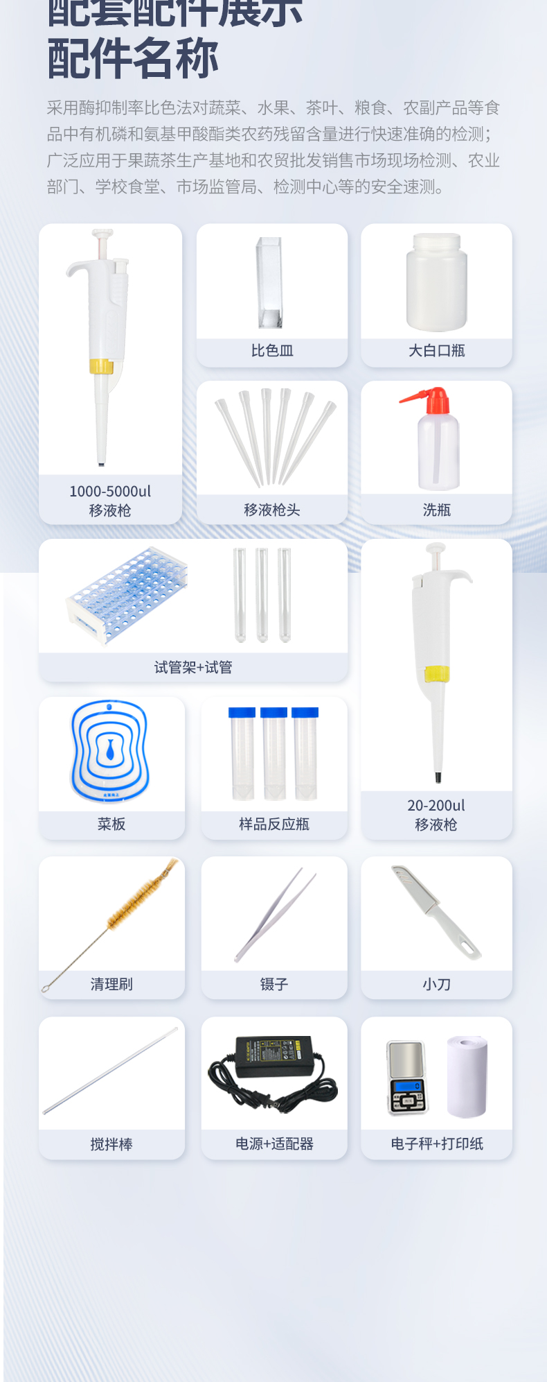 采用酶抑制率比色法对蔬菜、水果、茶叶、粮食、农副产品等食品中有机磷和氨基甲酸酯类农药残留含量进行快速准确的检测;广泛应用于果蔬茶生产基地和农贸批发销售市场现场检测、农业部门、学校食堂、市场监管局、检测中心等的安全速测。