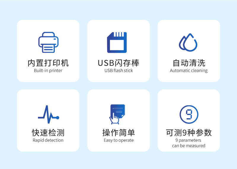 9、根据客户要求选择-电导率,内置打印机,USB闪存棒,第二蠕动泵自动清洗,PH值。