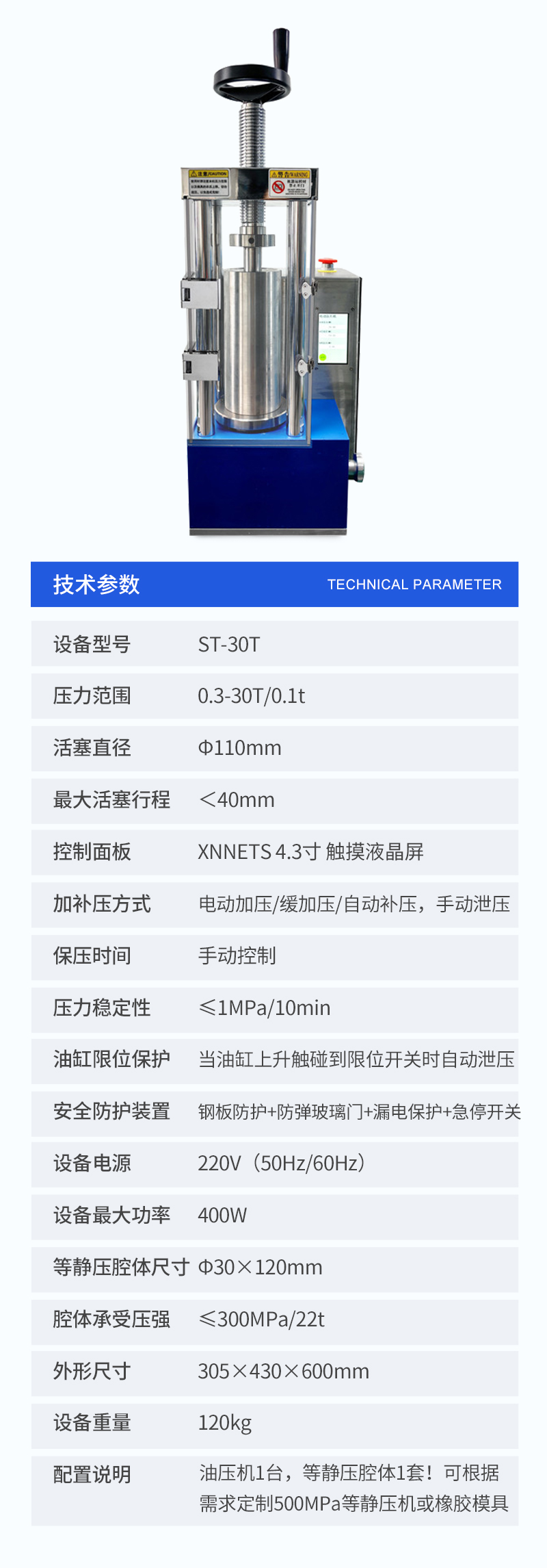 | 配置说明 | 油压机1台,等静压腔体1套!可根据需求定制500MPa等静压机或橡胶模具 |